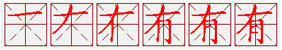 有字的基本解釋: ● 有yǒu ㄧㄡˇ ◎ 存在:有關(guān)。有方(得法)。有案可稽。有備無患。有目共睹。 ◎ 表示所屬:他有一本書。 ◎ 表示發(fā)生、出現(xiàn):有病。情況有變化。 ◎ 表示估量或比較:水有一丈多深。 ◎ 表示大、多:有學(xué)問。 ◎ 用在某些動詞前面表示客氣:有勞。有請。 ◎ 無定指,與“某”相近:有一天。 ◎ 詞綴,用在某些朝代名稱的前面:有夏。有宋一代。 ● 有yòu ㄧㄡˋ ◎ 古同“又”,表示整數(shù)之外再加零數(shù)。 反義詞 沒 無 英文翻譯 have, own, possess; exist |